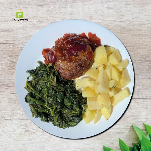 Hamburger van slagerij Jeroen de Vries | Nieuwe hollandse Aardapeltjes | Wilde Spinazie | Amerikaanse uien jus