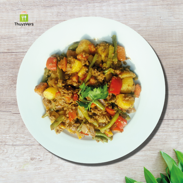 Hollandse nieuwe aardappel | Rundergehakt | Paprika | Hollandse Sperziebonen | Rode Ui | Wortel | Perzik | Sesam&Pinda sausje
