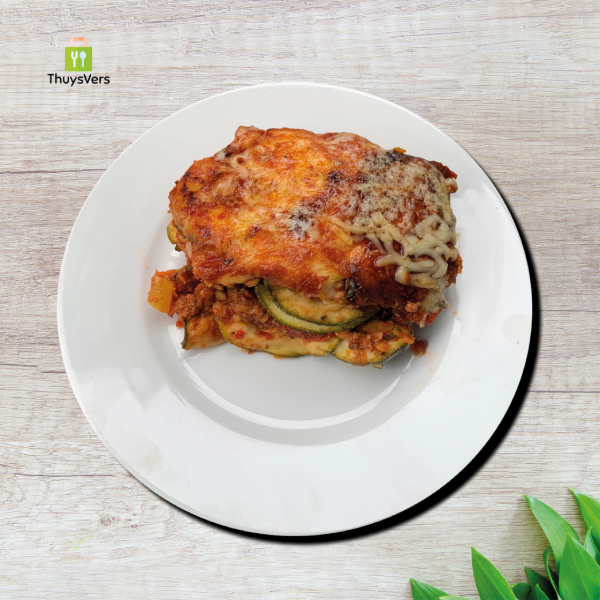 Lasagne opgebouwd met lagen van verse courgette afgewisseld met een verse tomatensaus van rode linzen, paprika, ui, verse basilicum, oregano & vega gehakt en afgetopt met twee soorten kaas.
