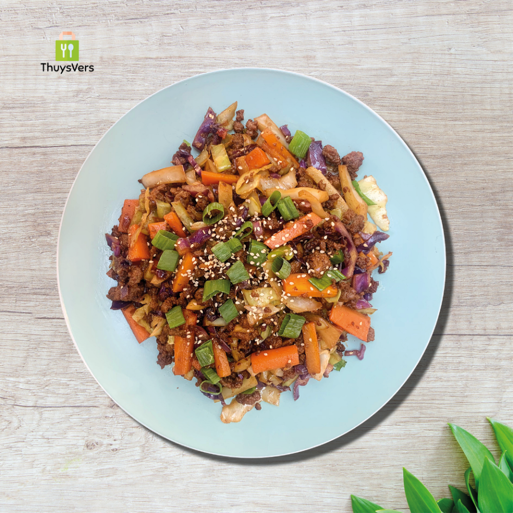 Een heerlijk zomersgerecht met Witte Kool, Rode Kool, Rundergehakt, Wortel, Ui in een Sesamsausje gebakken!