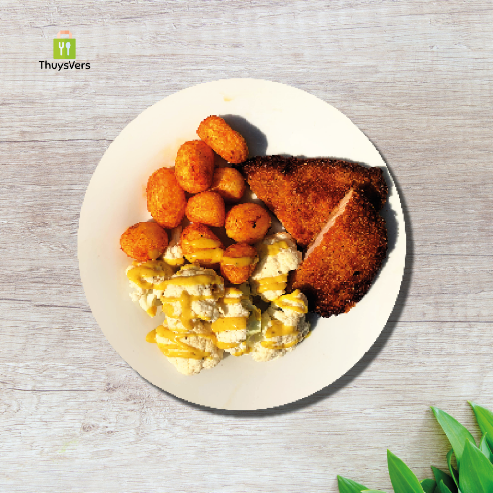 Gestoomde Bloemkoolroosjes in kerriesaus, gekruide Hollandse Krieltjes met een slagers schnitzel!